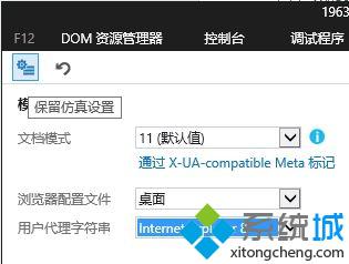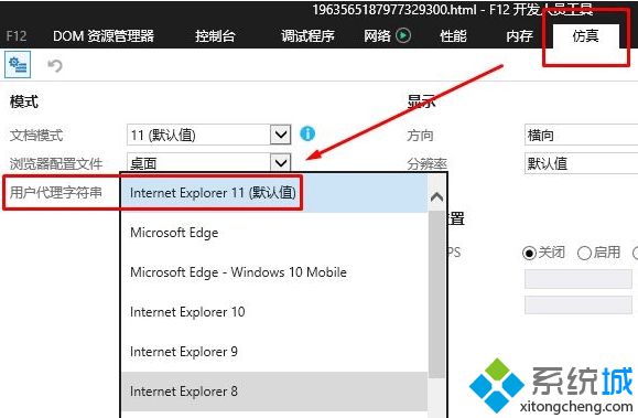 3、在开发人员工具中点击【仿真】,然后将下面的 用户代理字串符 下拉菜单选择 【internet Explorer 8】;