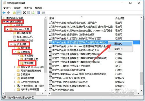 5:从打开的“组策略”窗口中,依次展开“计算机管理”-“windows设备”-“安全设置”-“本地策略”-“安全选项”项,在右侧找到“用户账户控制:用于内置管理员账户的管理员批准模式”项并右击,从其右键菜单中选择“属性”项。