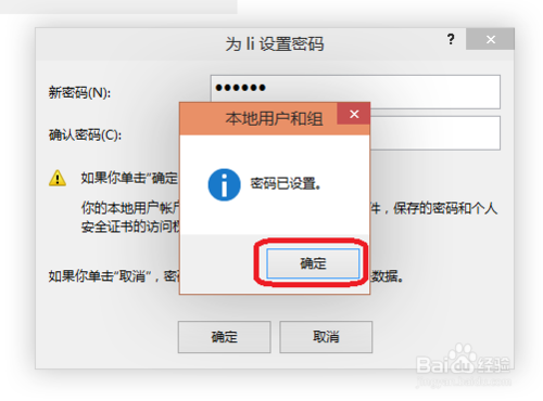 6:6、如下图单击确定之后就会出现密码已设置,单击确定。这就完成了密码设置。