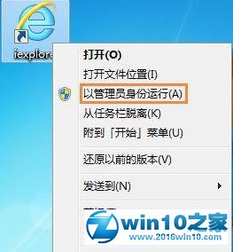 1、在iE浏览器图标单击鼠标右键选择“以管理员身份运行”;
