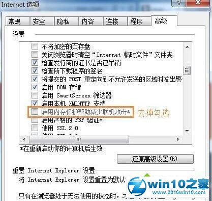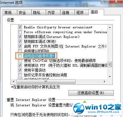 3、打开“internet属性”切到“高级”选卡,找到“启动内存保护帮助减少联机攻击”,把前面复选框的勾去掉,再找到“启用自动崩溃恢复”,同样取消打勾,点击确定即可;