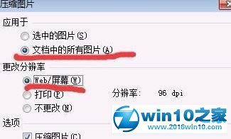 4、选择应用于“文档中的所有图片”,更为分辨率为“web/屏幕”,点击确定;