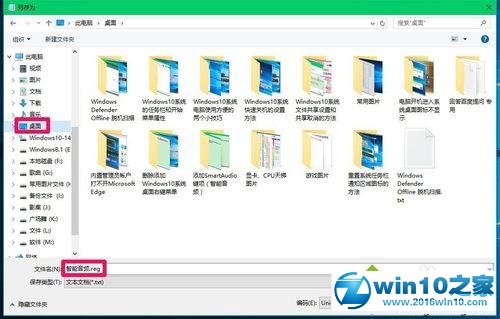 3、在另存为窗口,点击【桌面】,在文件名(n)栏中输入【智能音频.reg】,再点击:保存;