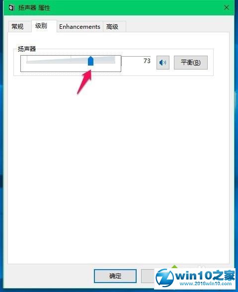 8、在扬声器 属性窗口,我们用鼠标按住蓝色小滑块,可以左右调节音量;