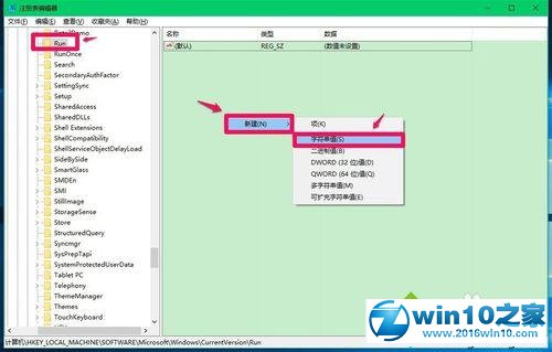 4、我们在CurrentVersion的展开项中找到:Run,并左键单击:Run,在Run对应的右侧窗口中,右键点击空白处 - 【新建(n)】-【字符串值(s)】;