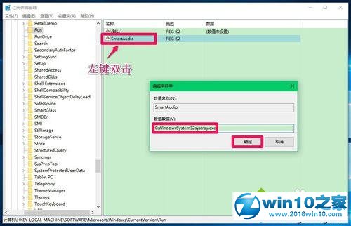 5、我们把新建#1命名为:smartAudio(智能音频),并左键双击:smartAudio,在弹出的编辑字符串对话框中,把smartAudio的数值数据定为:C:windowssystem32systray.exe,再点击:确定;