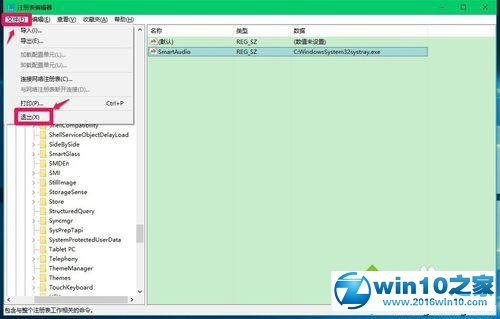 点击注册表编辑器窗口左上角的【文件】,在下拉菜单中点击【退出】,退出注册表编辑器;