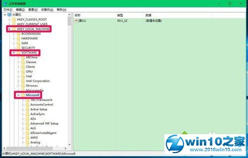 2、在打开的注册表编辑器窗口,展开HKEY_LoCAL_MACHinE\soFTwARE\Microsoft;