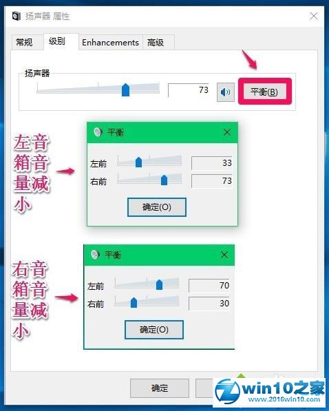 9、台式电脑一般配置有两个音箱(左、右音箱),如果我们需要调节左、右音箱的音量,可以点击平衡,减小左音箱或者右音箱音量的操作如图所示;