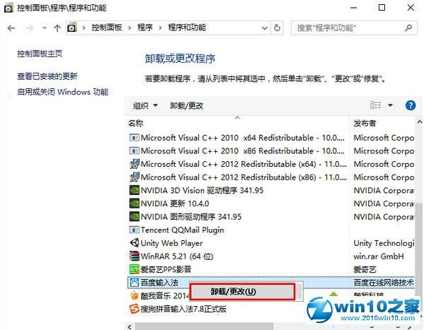3、在卸载和更改程序界面找到“百度输入法”,单击右键,选择“卸载/更改”,将其卸载,问题解决!