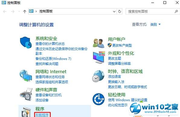 2、将控制面板的查看方式修改为“类别”,点击程序下面的“卸载程序”;