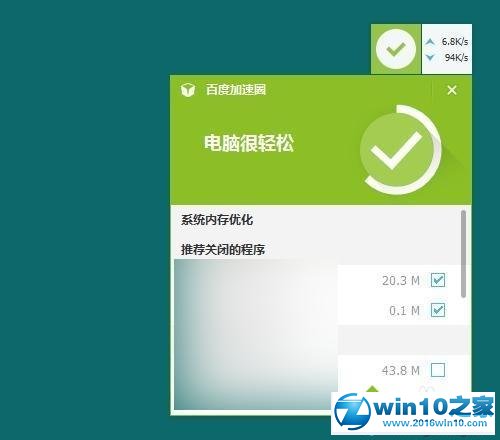 2、点击左边对号按钮,弹出的是加速圈,我们可以勾选需要关闭的程序,然后点击对号关闭。