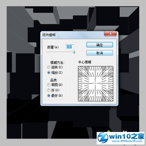 5、在弹出的对话框中设置数量为100,模糊方法为缩放品质为最好,点击确定按钮。