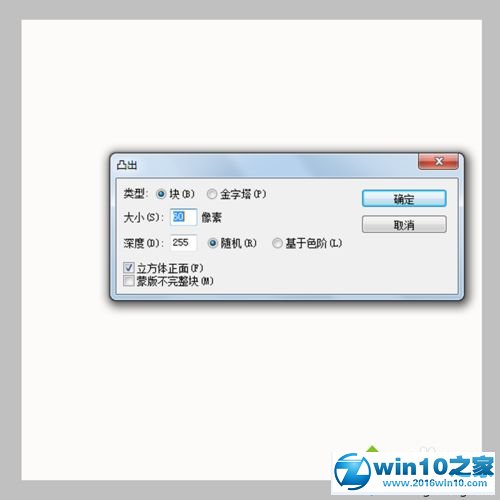 2、新建图层1,按ctrl+delete组合键填充白色,执行滤镜-风格化-凸出命令,在弹出的对话框中设置类型为块,大小为60像素,深度为255,随机点击确定。