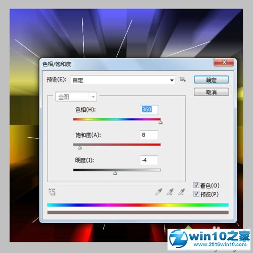 9、执行图像-调整-色相饱和度命令,在弹出的对话框中设置色相为360,饱和度为8,明度为-4,点击确定按钮。