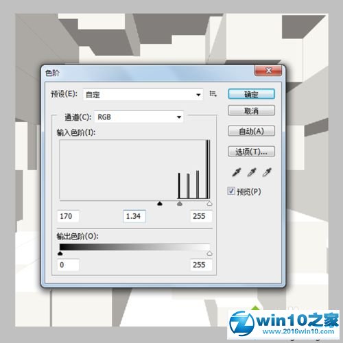 3、执行图像-调整-色阶命令,在弹出的对话框中设置数值为170/1.34、255,点击确定按钮。