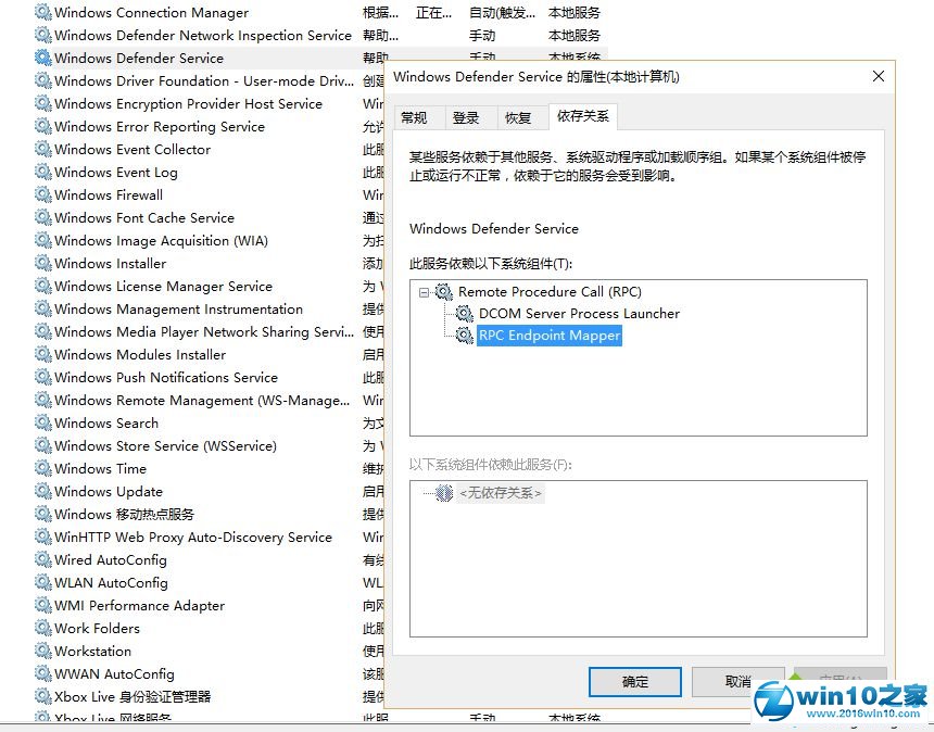 1、可以尝试查看windows defender serviece的依存关系,并从服务中将它的依存服务,从服务中找到并开启;