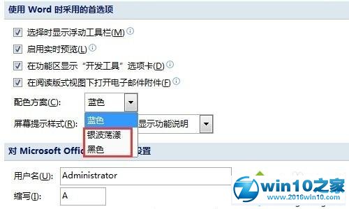 4、在”使用word时的首选项“中可以看到”配色方案设置,点击其右边的小三角,选择需要的主题颜色。