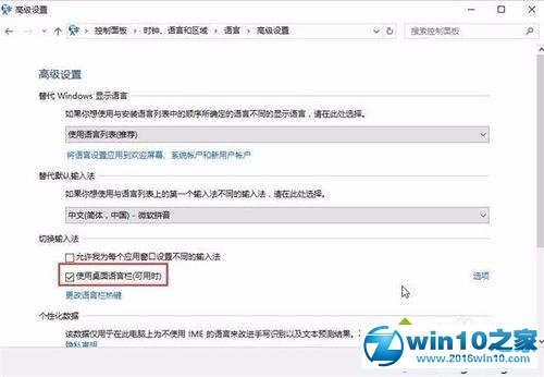 1、按win+x选择控制面板,然后依次选择时钟、语言和区域→语言→高级设置,勾选使用桌面语言栏,点击保存即可,如图所示: