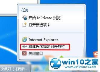 2、在任务栏上的iE选卡上单击右键,选择“将此程序锁定到任务栏”;
