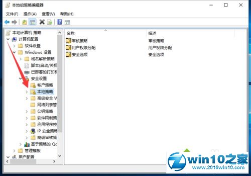 4、在本地组组策略编辑器对话窗口的左侧窗格,依次展开“计算机配置”-->“windows设置”-->“安全设置”-->“本地策略”选项。
