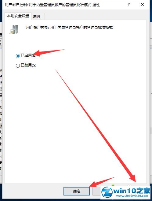 7、在打开的“用户帐户控制:用于内置管理帐户的管理员批准模式”属性对话窗口中,点击“已启用”后,在点击底部的“应用”-->“确定”按钮退出设置界面即可。