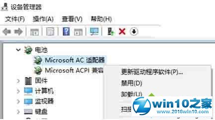 2、找到并展开电池选项,分别右键单击两个子项,先禁用,再重新启用,一般情况下通知区域中的图标就会重现了。