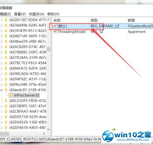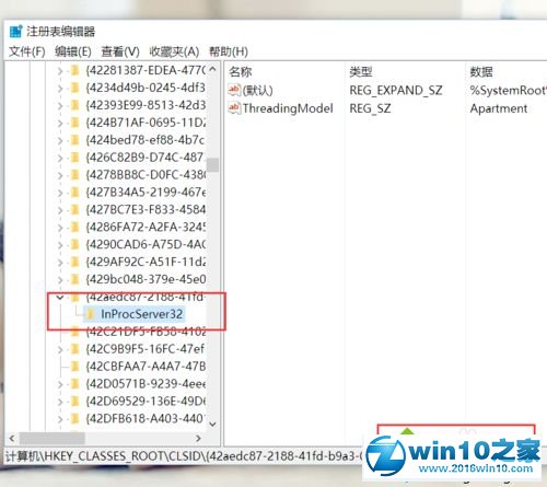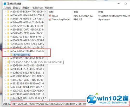 2、打开注册表编辑器页面之后,双击打开左侧的注册表子项,将注册表子项定位至:HKEY_CLAssEs_RooT\CLsid\{42aedc87-2188-41fd-b9a3-0c966feabec1}\inprocserver32