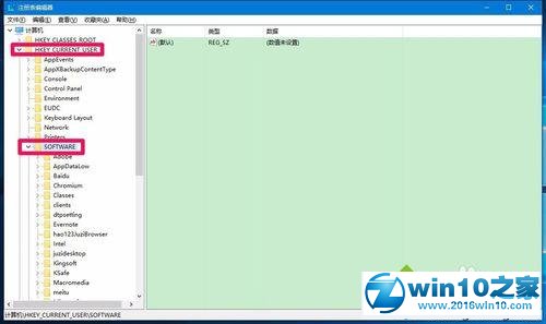 3、在注册表编辑器窗口中依次展开:HKEY_CURREnT_UsER\software;