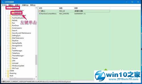 6、在CurrentVersion的展开项下找到policies - Explorer,并左键单击:Explorer;