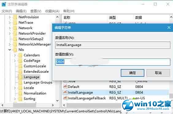 3、在右侧最底部找到名为installLanguage的注册表键值,该键值即代表系统的显示语言。我们要做的就是将其修改为想要升级到的系统语言代码即可,如下图所示: