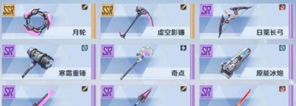 2、其中镰刀、环刃是作为破盾武器,冰弓、双枪、红莲作为输出武器,