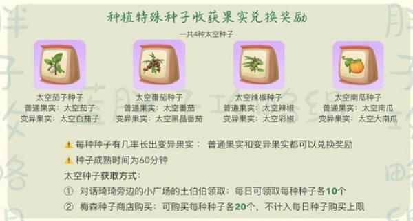 太空种子可以种出普通太空果实,有几率长出变异太空果实,普通和变异太空果实均可兑换奖励