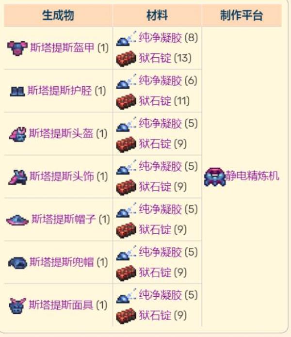 泰拉瑞亚斯塔提斯套装是在“静电精炼机”上面合成的,困难模式前可以由狱石锭和纯净凝胶制作的护具。制作一套斯塔提斯套装需要33个狱石锭和19个纯净凝胶。而制作全套需要69个狱石锭和39个纯净凝胶。