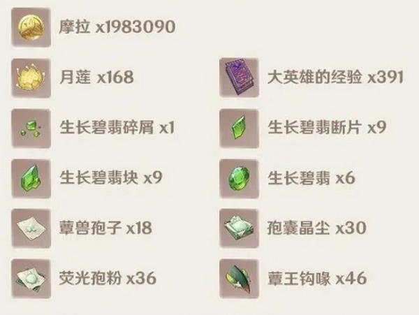 20级突破:20000摩拉、生长碧翡碎屑1个、月莲3个、蕈兽孢子3个