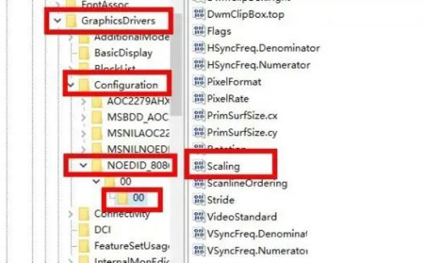 3、在NOEDID..中打开“00”下拉,双击右侧的“scaling”
