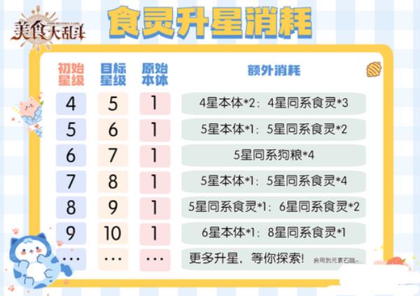 3、为食灵们升星是需要消耗食灵(狗粮)的!其实不同的升星索要消耗的种类数量也不相同,小编为大家准备了升星表格