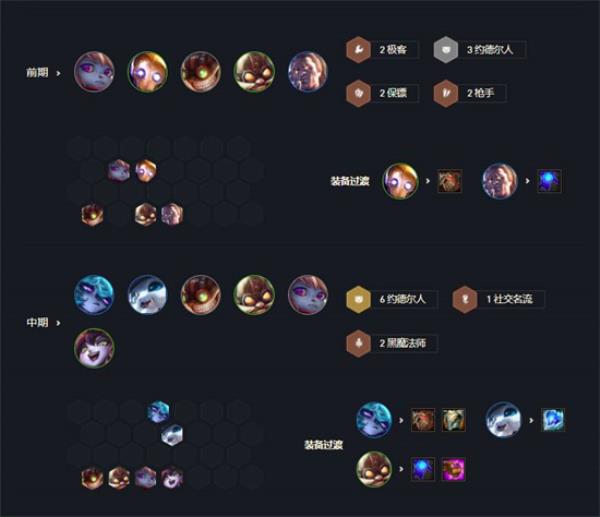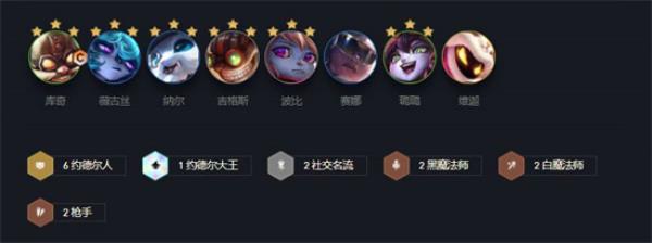 1、阵容组成:约德尔法阵容主要是由约德尔人、黑魔法师和社交名流组成。