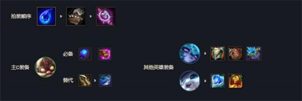 3、法爆、蓝BUFF飞机必备,不然小法来之前阵容没伤害,需要飞机输出;肉装给薇古丝。