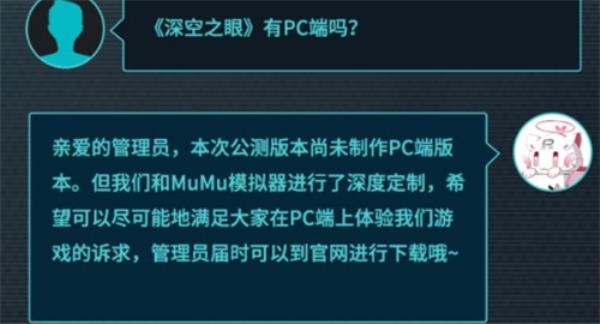 首先官方已经回答了这个问题,表明目前还没有PC端版本,但是和MuMu模拟器进行了深度定制,可以在官网上下载mumu深度定制版本的深空之眼,从而实现在电脑上游玩这款游戏。