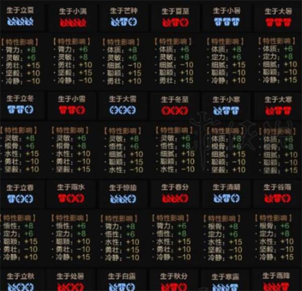 2、出生时节会直接影响人物属性,表现为具体的时节特性。