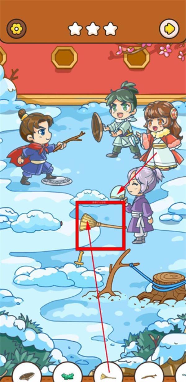 1、拖动女王的扇子给拿扫帚的军师,扫把会掉在地上。