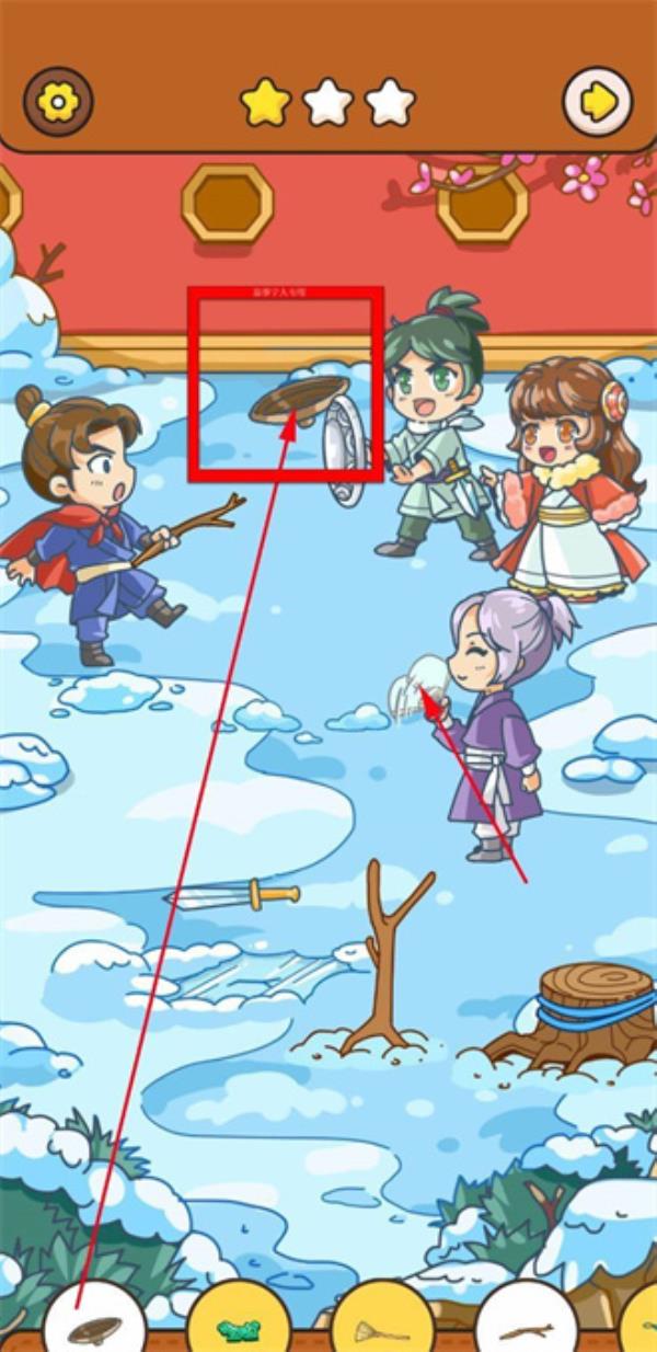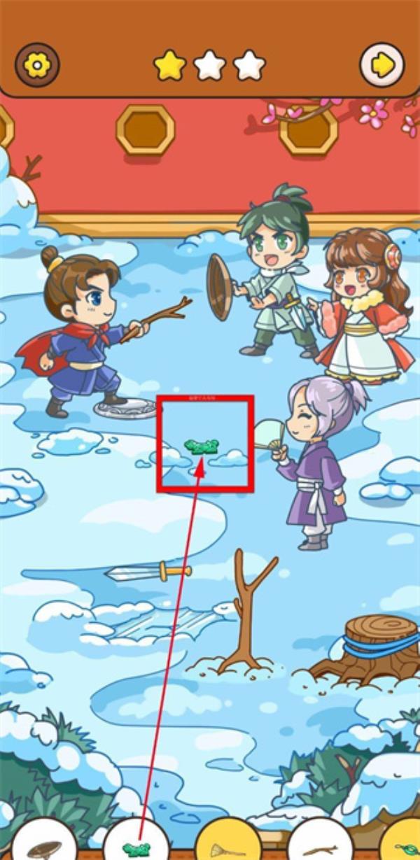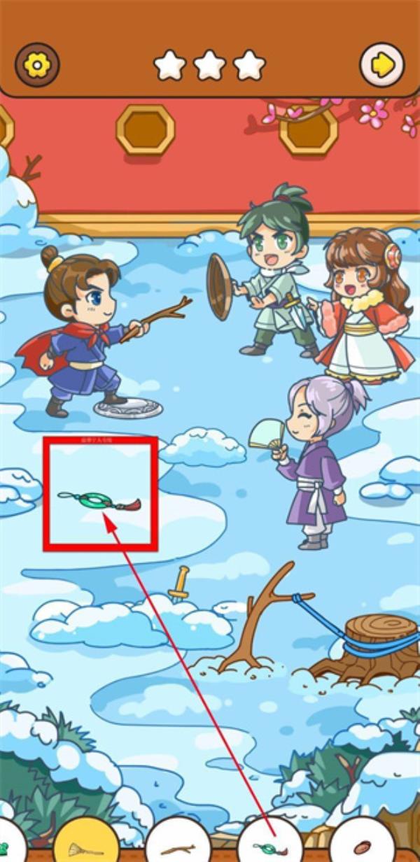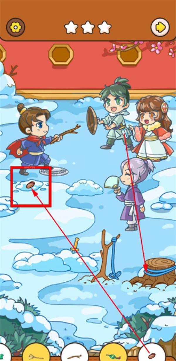 6、滑动2次剑柄下的雪堆,拖动2次绿衣禁卫腰间的匕首割断蓝色绳子,拖动绑在 树杈上的蓝色绳子到剑柄上,把剑拔出来,最后把剑给左边的人物换他手里的树枝,这样即可通过女王这一关。