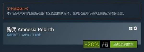 今日,由Frictional Games制作并发行的生存恐怖游戏《失忆症:重生(Amnesia: Rebirth)》在Steam平台开启了打折促销,本作迎来了“新史低”特惠。游戏原价90元,现在打8折,折后价72元。本次特惠截止日期为12月12日。