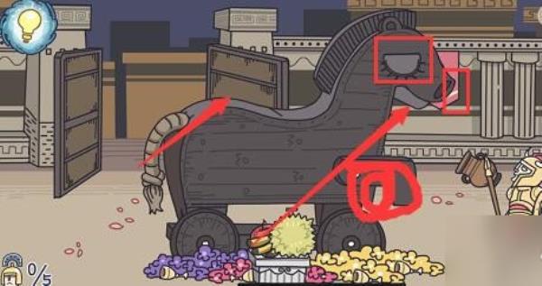 2、第一个是点击木马的眼皮位置往上翻,希腊士兵就会出现,等他出现要快速这个出现的希腊士兵,如果被右侧穿铠甲的发现了(头有感叹号就是发现了),就会导致失败,每一个都是这样的。