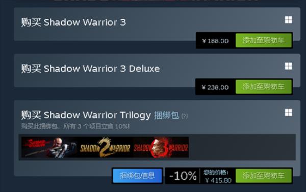 2、找到游戏后,玩家进入详情页面,可以发现游戏售价是188元、豪华版238元、捆绑包415.80元(捆绑包包括影子武士1到3全部版本)。