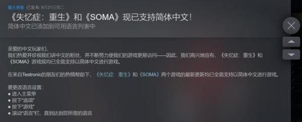 在来自Testronic的朋友们的热情帮助下,《失忆症:重生》和《SOMA》两个游戏的最新更新均已全面支持以简体中文进行游戏。