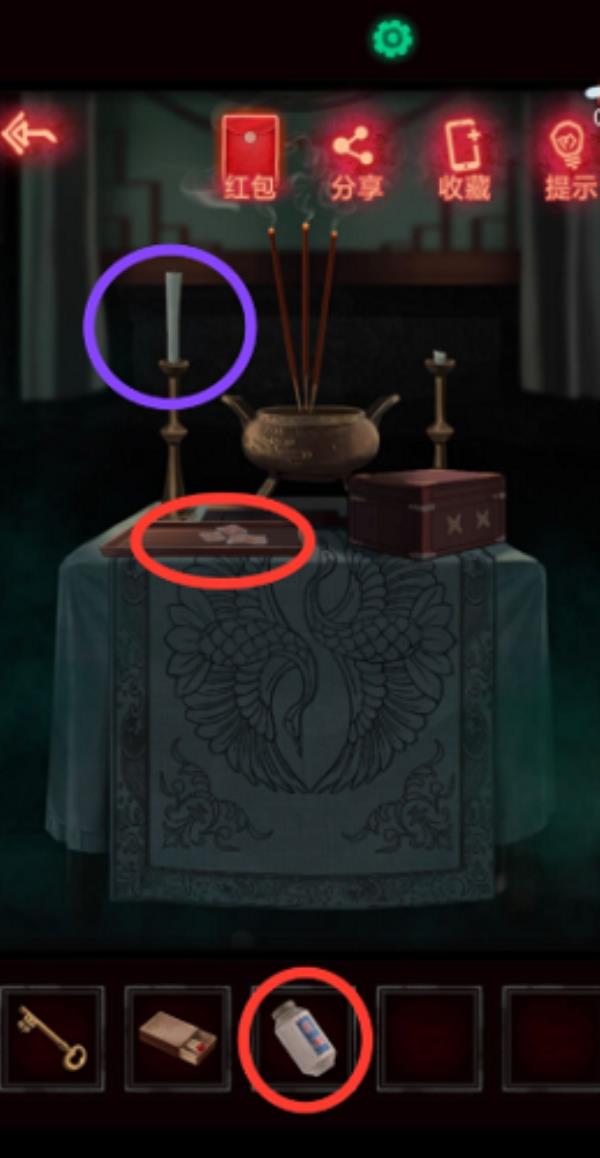 点击蜡烛,再点击最右边的灯笼,然后用火柴把熄灭的灯笼点燃。