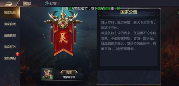 显示玩家所属国家的旗帜,以及国家君王信息和国家公告。