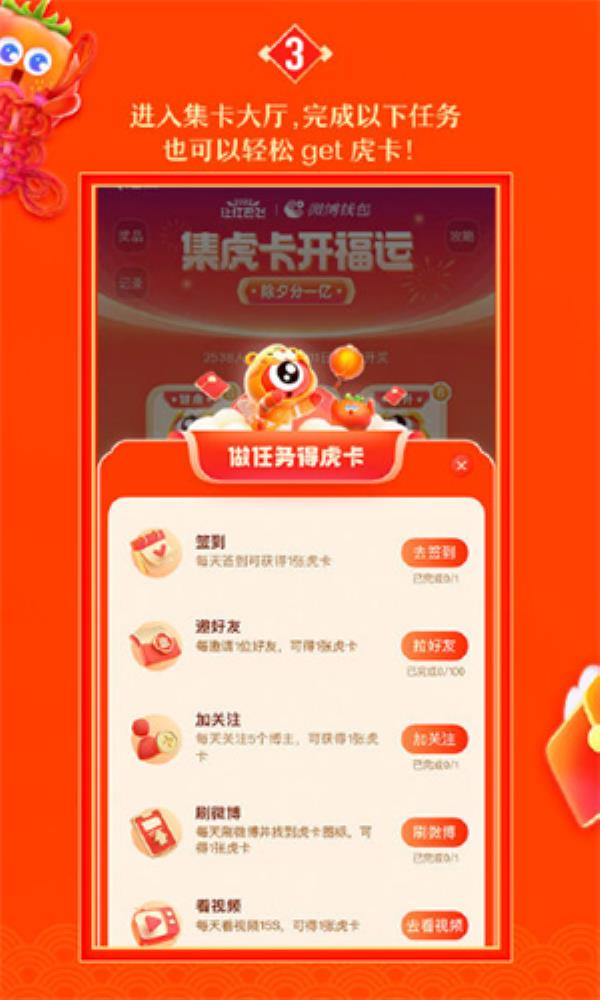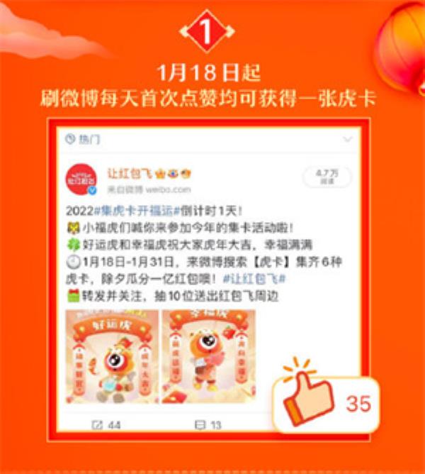 1、1月18日开始,刷微博每天首次点在均可获得一张虎卡。
